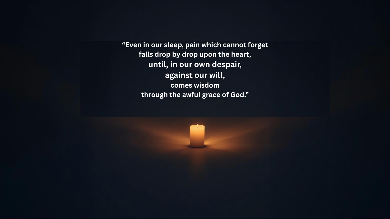 “Even in our sleep, pain which cannot forget…” reminds us that wisdom often arrives through suffering and that compassion can grow from shared grief.